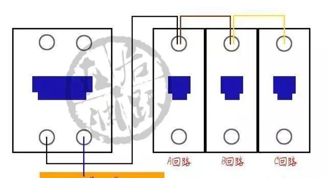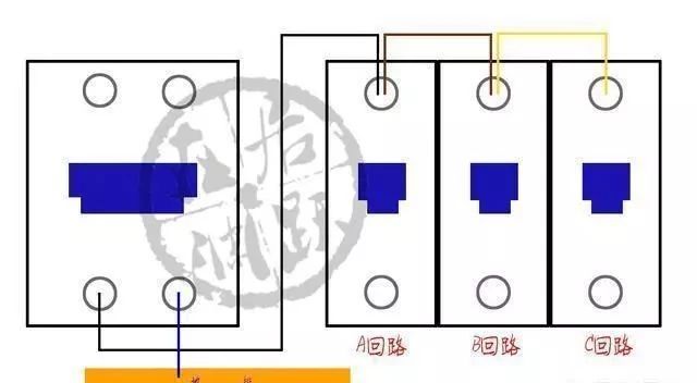 这里A,B,C三个回路的断路器,都需要从主开关取进线。于是就从主开关的负载端引出三根电线——这是常规接法。